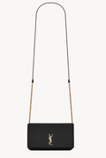 Cell phone holder with front flap decorated WITH THE CASSANDRE, featuring a leather and chain shoulder strap.